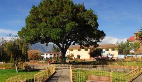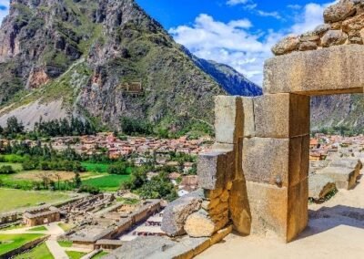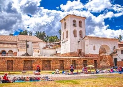 Pueblo tradicional andino con iglesia colonial construida sobre bases incas.